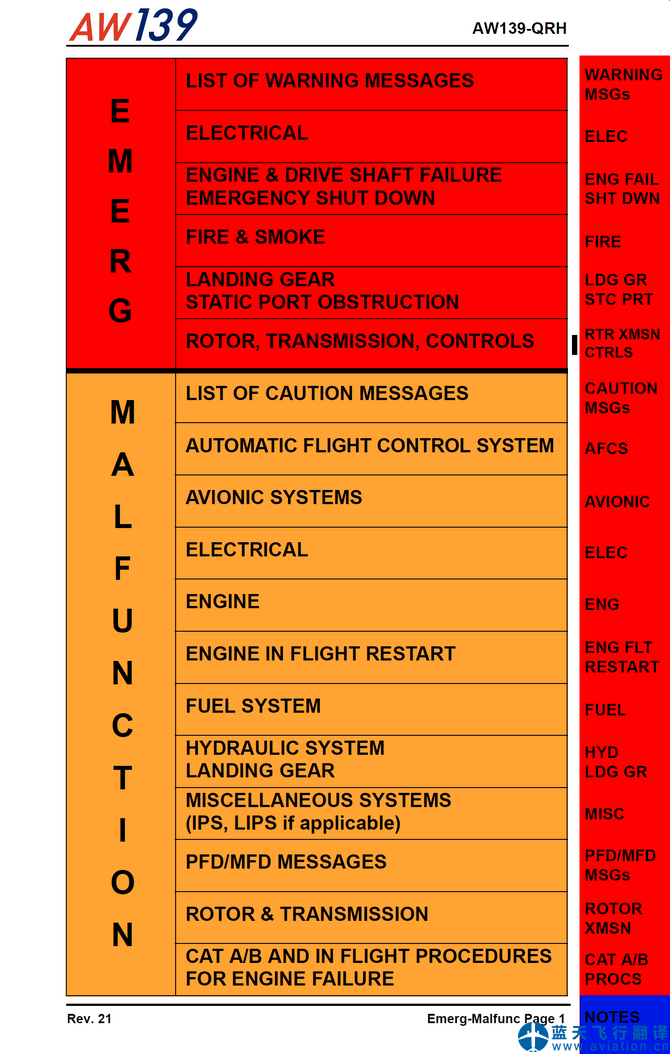AW139直升機(jī)快速檢查單(Quick Reference Handbook(QRH))的主要內(nèi)容包含有: