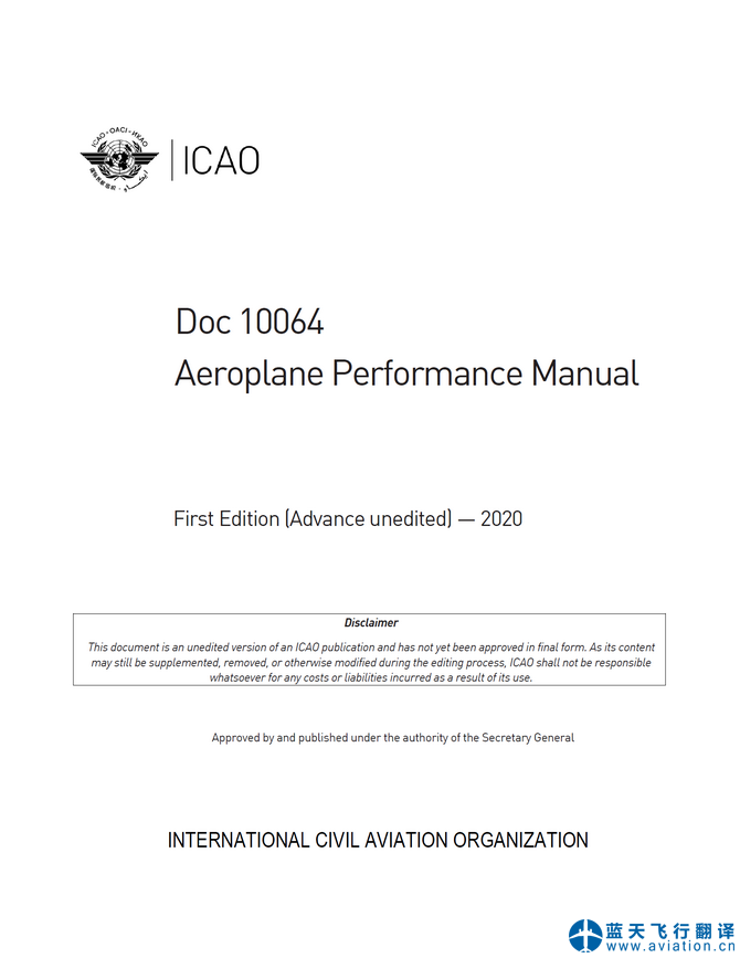 北京藍天飛行翻譯公司承接國際民航組織飛機性能手冊翻譯任務(wù) INTERNATIONAL CIVIL AVIATION ORGANIZATION, Aeroplane Performance Manual Translation