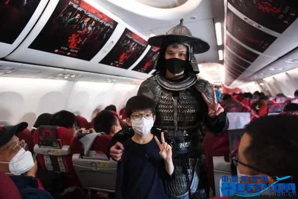 電影角色扮演者在客艙內(nèi)與小旅客合影 航行期間,客艙廣播為旅客播報電影相關(guān)引導(dǎo)互動式廣告,空乘還化身劇中角色與旅客互動,沉浸式營造空中探案氛圍。此外,角色扮演者還身穿禁軍磐龍營副將鄭萬的盔甲驚喜亮相客艙,為互動旅客帶來精美周邊禮品。