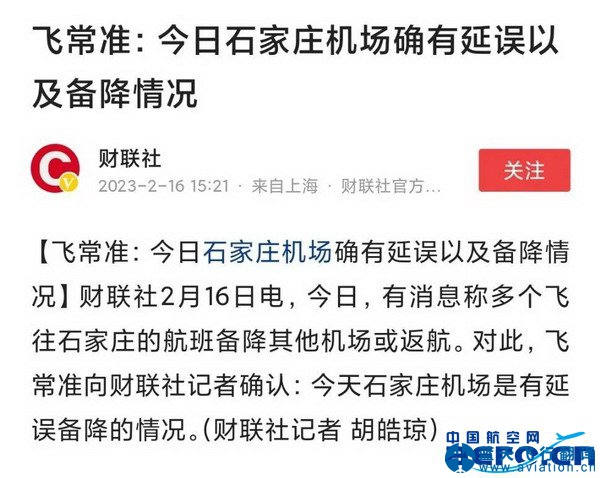 2月16日,有消息稱中午前后多個(gè)飛往石家莊的航班備降其他機(jī)場或返航。有網(wǎng)友稱是大霧原因,還有網(wǎng)友稱石家莊上空全部都是軍機(jī)。