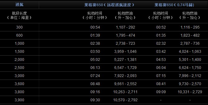 輪擋時(shí)間及輪擋燃油 4名乘客,2名駕駛員,每人以200磅(91公斤)計(jì),國(guó)際標(biāo)準(zhǔn)大氣,無風(fēng),符合NBAA IFR規(guī)定的備份燃油條件。(200海里備降距離)。起飛條件:海平面、國(guó)際標(biāo)準(zhǔn)大氣、最佳起飛重量 最大使用速度