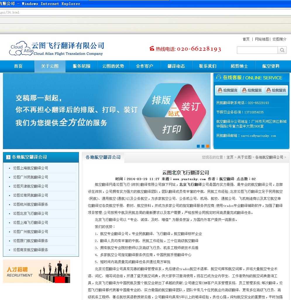 在1年多以前,曾經(jīng)發(fā)現(xiàn)一個叫“云圖飛行翻譯公司”的騙子公司,其所發(fā)表新聞里面,大量剽竊藍(lán)天飛行翻譯公司網(wǎng)頁,其中有大量藍(lán)天飛行翻譯公司的案例,騙子公司云圖飛行翻譯公司經(jīng)過仿站,將藍(lán)天飛行翻譯公司的大量網(wǎng)頁原封不動轉(zhuǎn)移過去,甚至于騙子公司云圖飛行翻譯公司的網(wǎng)站上網(wǎng)站內(nèi)容里面出現(xiàn)了藍(lán)天飛行翻譯公司的產(chǎn)品名稱: 舉例如下: ![]() ![]() 而此新聞最初是由藍(lán)天飛行翻譯公司原創(chuàng)發(fā)表: ![]() 藍(lán)天翻譯公司原創(chuàng)網(wǎng)頁截圖 上部分剽竊自藍(lán)天飛行翻譯公司介紹,下段剽竊自http://www.benqun.cn/2011/0404/116.html如鏈接所示。 騙子公司云圖飛行翻譯公司只是將藍(lán)天換成了云圖,就連北京2個字都未做改動,其中盡然出現(xiàn)了“開通了藍(lán)天航空詞典”,這種公司,懶到就連最基本的都不改動,不說什么了,公布該公司信息如下: 騙子公司名稱:深圳云圖飛行翻譯有限公司 騙子公司電話:020-66228193 騙子公司聯(lián)系人:楊俊濤 13710054035 騙子公司電子郵件:service@yuntusky.com 騙子公司地址:廣州市天河區(qū)珠江新城華強(qiáng)路2號富力盈豐大廈2906室 拿著藍(lán)天飛行翻譯公司的成功案例而欺騙消費者的公司,騙子公司云圖飛行翻譯公司。