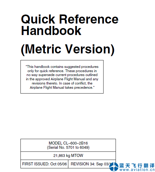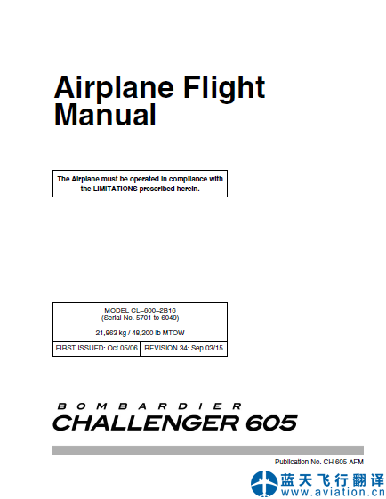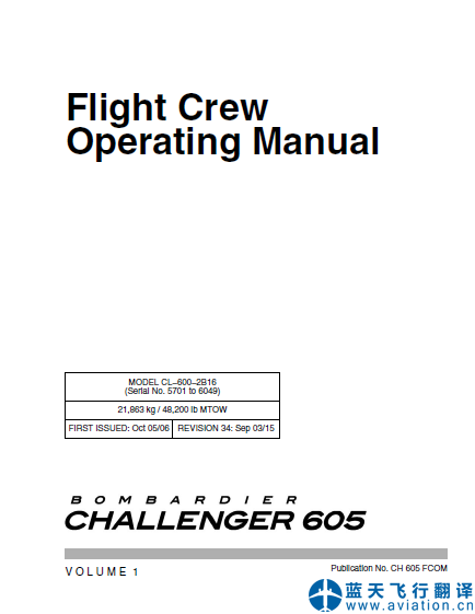 北京藍天飛行翻譯公司完成公務(wù)機公司的第34版龐巴迪挑戰(zhàn)者605全套飛行手冊翻譯任務(wù) REVISION 34: Sep 03/15 Bombardier Challenger 605 Flight Manual Translation 第34版龐巴迪挑戰(zhàn)者605飛機飛行手冊 Bombardier Challenger 605 Airplane Flight Manual