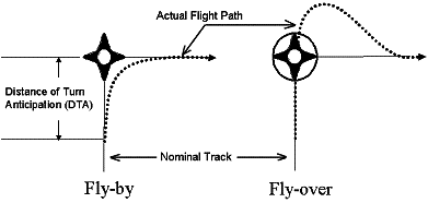 To inform flight crews of an erroneous distance to waypoint anomaly and subsequent fly-over instead of fly-by waypoint in the route. 出自757FCOM fly-over必須得經過航路點上空,可以翻為“飛越” fly-by不經過航路點上空,可以翻為“從航路點旁飛過” ![]() Fly-by 與 Fly-over ![]() Fly-by versus Fly-over waypoint |