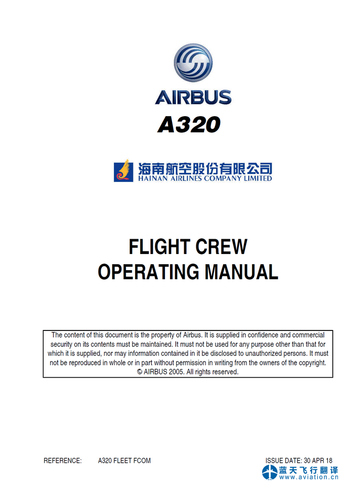 北京藍天飛行翻譯公司完成航空公司2018年4月30日版本空客A320機組操作手冊翻譯任務(wù) 30 APR 18 A320 FLIGHT CREW OPERATING MANUAL Translation 本次翻譯的空客機型包含空客A320系列中的319-132、319-133、320-232、320-214等機型。 ![]() A320飛機機組操作手冊 A320 FLIGHT CREW OPERATING MANUAL |