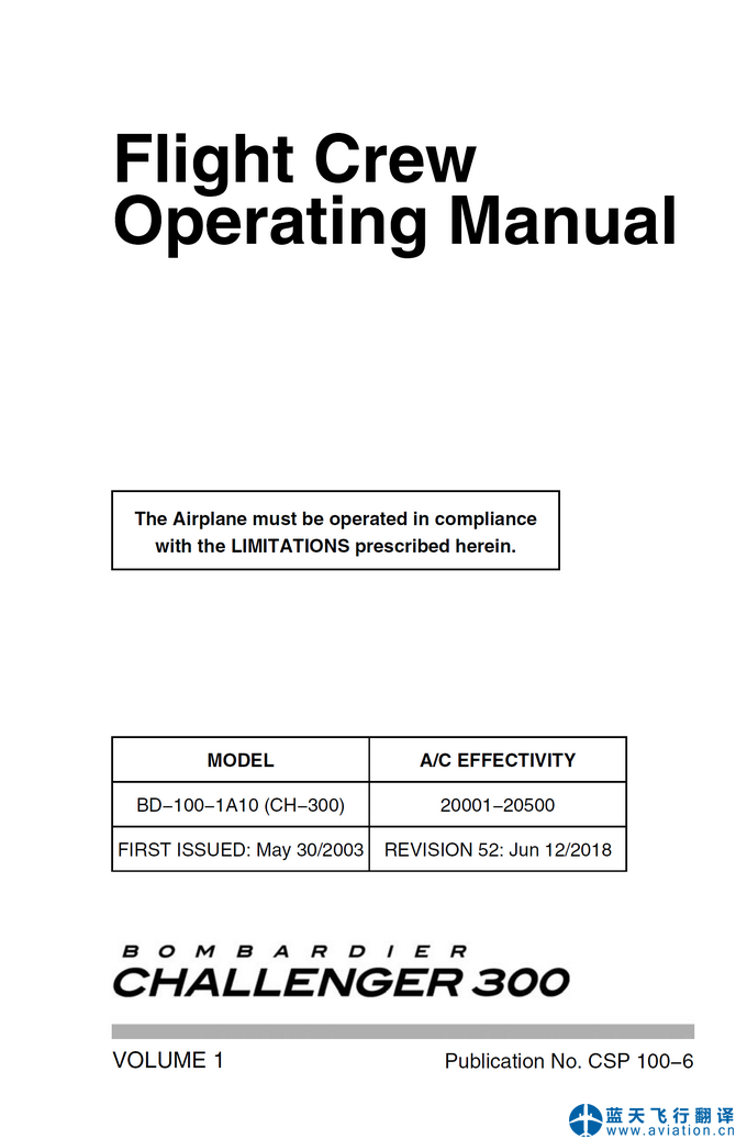 北京藍(lán)天飛行翻譯公司承接公務(wù)機(jī)公司2018年6月12日第52版龐巴迪挑戰(zhàn)者300公務(wù)機(jī)全套飛行手冊(cè)翻譯任務(wù) REVISION 52: Jun 12/2018 Bombardier Challenger 300 Flight Crew Operating Manual, Airplane Flight Manual and Quick Reference Handbook Translation
