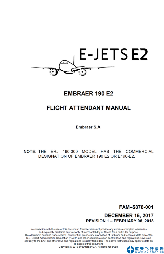 北京藍(lán)天飛行翻譯公司承接航空公司 EMBRAER 190 E2 乘務(wù)員手冊(cè)翻譯任務(wù) EMBRAER 190 E2 FLIGHT ATTENDANT MANUAL Translation