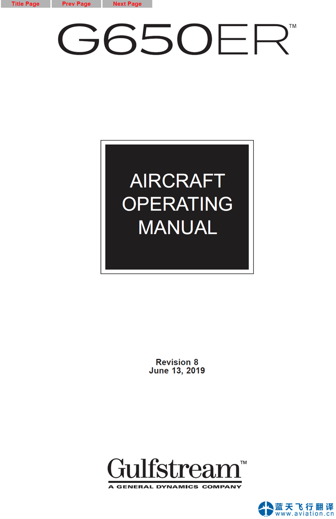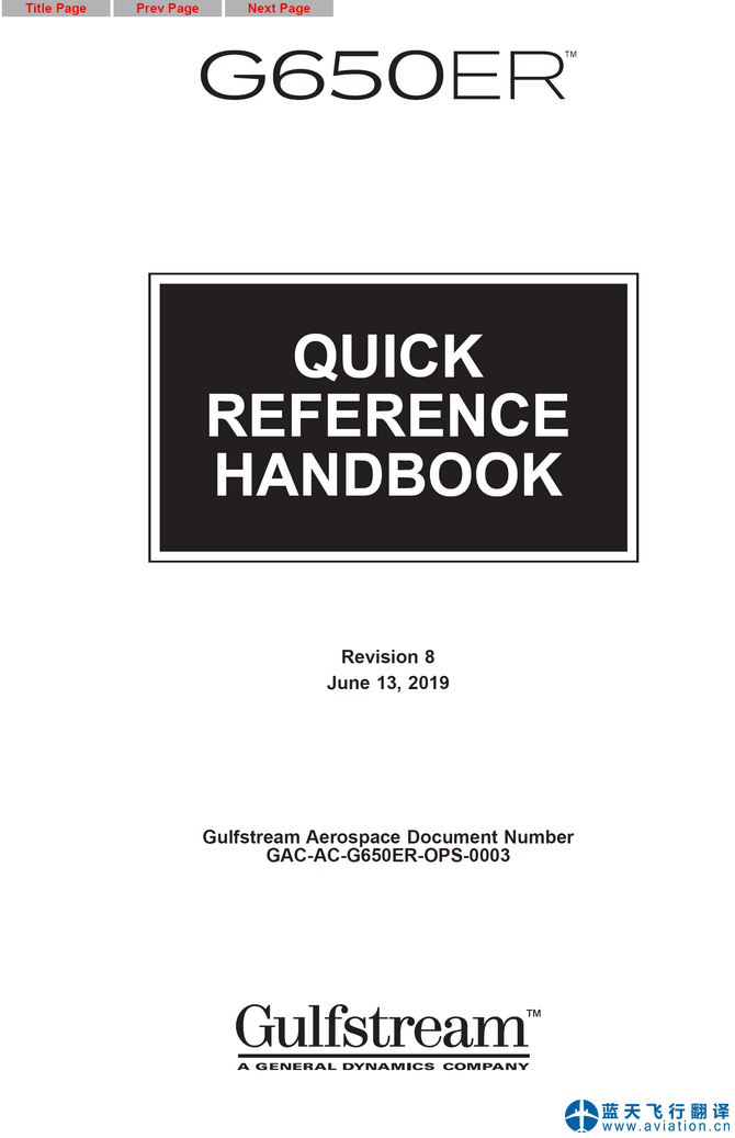 北京藍(lán)天飛行翻譯有限公司完成2019年6月13日版本灣流G650ER飛機(jī)操作手冊(cè)、快速檢查單和飛機(jī)飛行手冊(cè)翻譯任務(wù) Revision 8 June 13, 2019 G650ER AIRCRAFT OPERATING MANUAL, G650ER QUICK REFERENCE HANDBOOK and G650ER AIRPLANE FLIGHT MANUAL Translation