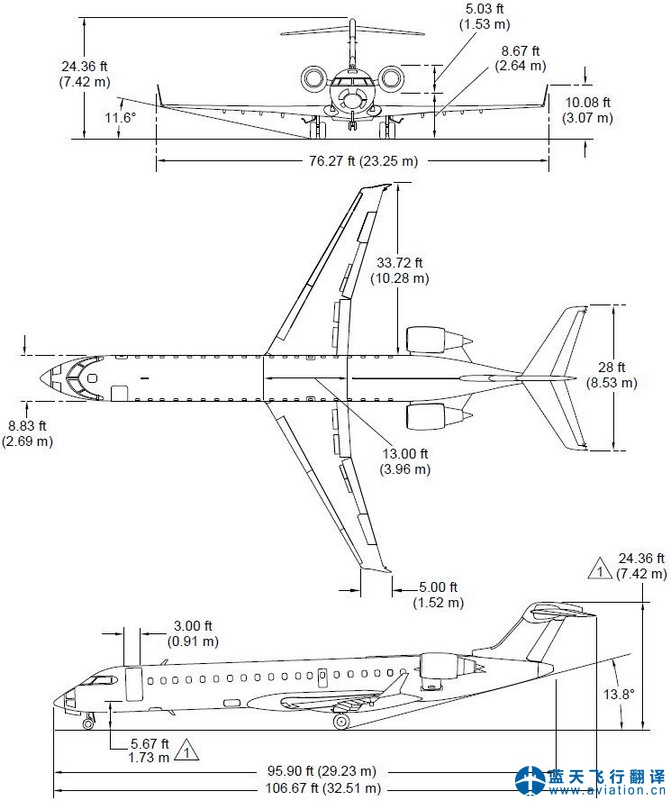![]() CRJ700飛機尺寸 ![]() CRJ700 快速檢查單 CRJ700 QUICK REFERENCE HANDBOOK ![]() CRJ700 快速檢查單 CRJ700 QUICK REFERENCE HANDBOOK CRJ700飛機是CRJ200飛機的加長型,兩者在機體結構和操縱使用方面具有很高的通用性。與CRJ200相比,CRJ700的主要特點是:通過在CRJ200中機身的前、后方加入艙段,增大了 機身和客艙長度;通過在機翼根部增加插入段,增大了翼展;換裝了推力更大的新型發(fā)動機;每客千米的直接使用成本降低了20%。該機的維修間隔時間設計為A檢400h,C檢4000h。采用帶有翼翹的后掠式下單翼;后部機身靠上安裝兩臺通用電氣CF34渦輪風扇發(fā)動機;具有后掠式T型垂直尾翼和水平尾翼。其機翼前緣前伸,并加裝了前緣縫翼。主起落架結構也進行了加強,采用新的輪胎和剎車系統(tǒng),設計壽命提高。 除特別指明外,以下描述均針對CRJ701與CRJ200的不同之處。 機身 前機身加長3.96m,后機身加長0.76m。 機翼 翼展增加1.83m。機翼前緣前伸,并加裝了前緣縫翼。 尾翼 尾翼增大了平尾面積。 起落架 液壓收放的前三點起落架,均為雙輪,由美國古德里奇公司提供。設計壽命提高到80000次起降。主起落架支柱延長,采用新的機輪、輪胎和剎車裝置,其中輪胎壽命提高到250~400次著陸 ,剎車片壽命提高到1600次著陸剎車。主輪輪胎規(guī)格36×12.0-18,胎壓10.55×105Pa。前輪輪胎規(guī)格20.5×6.75-10,胎壓9.24×105Pa。動力裝置 2臺尾吊安裝的CF34-8C1渦扇發(fā)動機,單臺額定推力為56.4kN(不包括自動功率儲備)或61.3kN(包括自動功率儲備),可在氣溫30。C,其他條件符合國際標準大氣的情況下保持推力。CRJ705換裝了CF34-8C5渦扇發(fā)動機,單臺額定推力為58.4kN(不包括自動功率儲備)或64.5kN(包括自動功率儲備)。CRJ705還可選裝CF34-8C5A1渦扇發(fā)動機。有反推力裝置。全權數字電子控制。機內總燃油容量為10989L,有壓力和重力加油口。[5] 駕駛艙與客艙 全增壓機艙,雙人制駕駛艙?团摌藴什季譃70座,每排4座并有中央通道,排距79cm,中央通道寬41cm,高1.89m。客艙地板降低2.5cm,頂板抬高1.3cm,舷窗位置抬高11.5cm。衣櫥、廚房和盥洗室有多種組合方式,具體取決于客艙布局。重新設計了頭頂行李柜,并在客艙前部地板下方左側新設1個容 積為3.08m3的行李艙,全機行李艙容積增加了近10m3。CRJ705的客 艙標準布局為75座,每排4座并有中央通道,爵士航空公司訂購的飛機采用兩級布局,即公務艙10座、排距94cm和經濟艙65座、排距87cm。