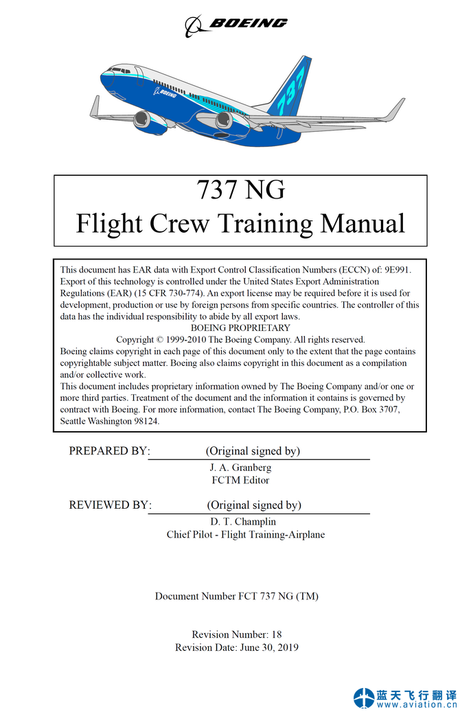 北京藍(lán)天飛行翻譯公司本次翻譯的波音737NG飛行機(jī)組訓(xùn)練手冊(cè)(Flight Crew Training Manual)版本日期為2019年6月19日,適用737-600、737-700、737-800、737-900、737-900ER機(jī)型。