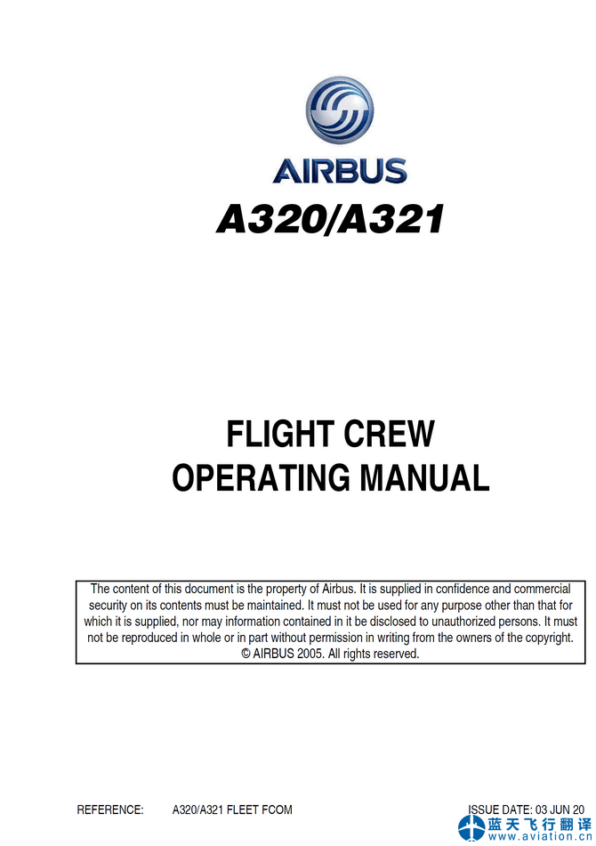 北京藍天飛行翻譯有限公司完成大型航空公司2020年6月3日版本空客A320/A321飛行機組操作手冊翻譯任務 A320/A321 FLIGHT CREW OPERATING MANUAL Translation