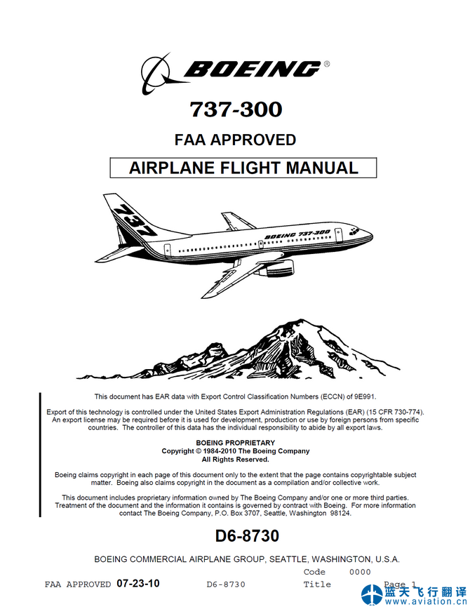 北京藍(lán)天飛行翻譯公司承接航空公司737-300飛機(jī)飛行手冊翻譯任務(wù) 737-300 Airplane Flight Manual Translation